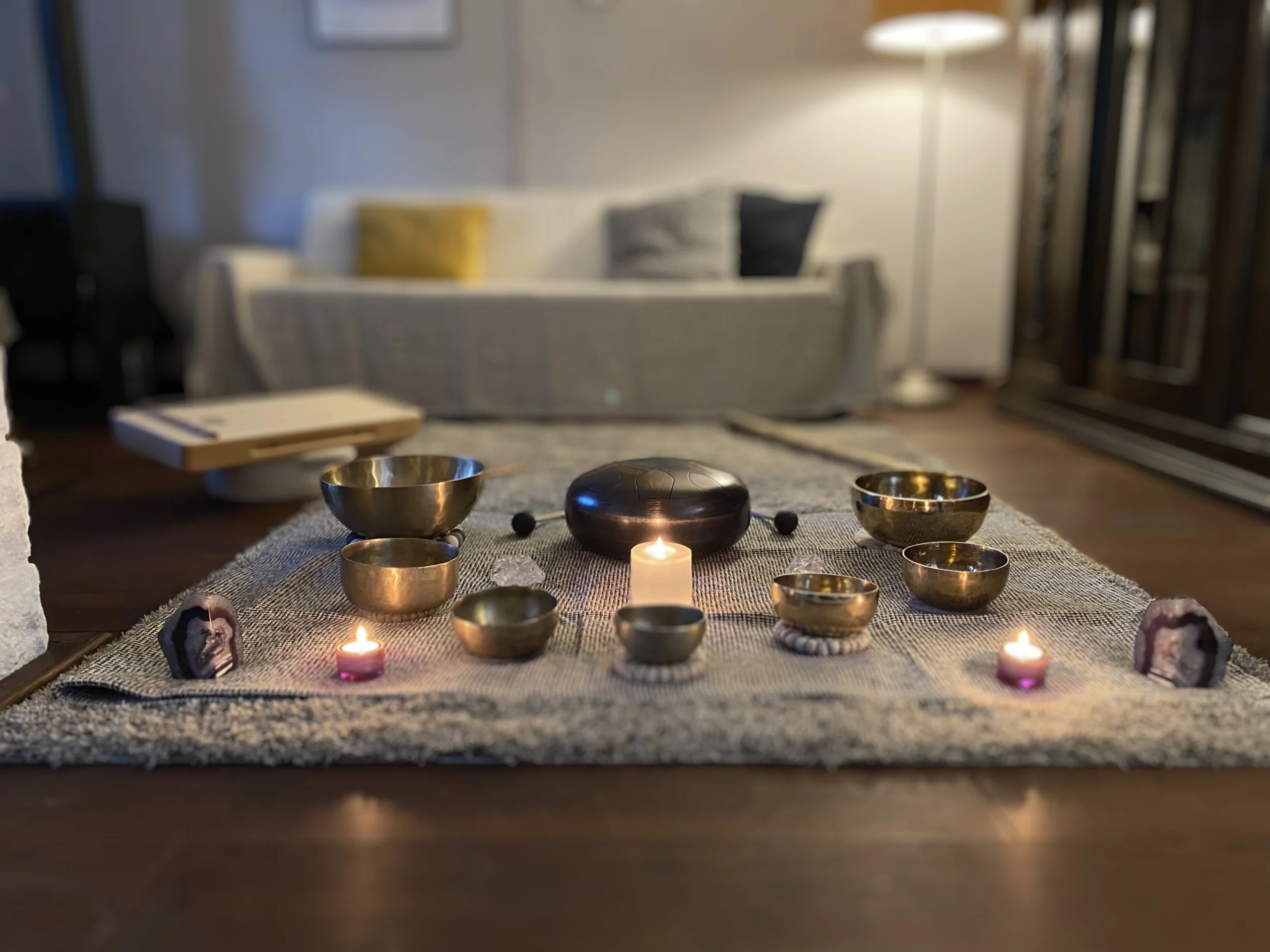 Ich arbeite mit dem vollen Spektrum obertonreicher, entspannender Klänge: neben z.T. antiken Klangschalen mit Planeten- Erd- und Körpertönen, wirken in meinen Klangräumen auch Kristallinstrumente, Gongs, Zungentrommeln, Monochord, Shruti-Box, Harmonium, Rasseln, Trommeln und vieles mehr. Mein Repertoire ist in ständiger Bewegung. Keine Klangreise bei mir ist gleich. Eines meiner wichtigsten Instrumente ist meine Stimme, die als Türöffner für Frequenzen dient, die ganz individuell auf dich und deine Bedürfnisse abgestimmt sind – körperlich und geistig.